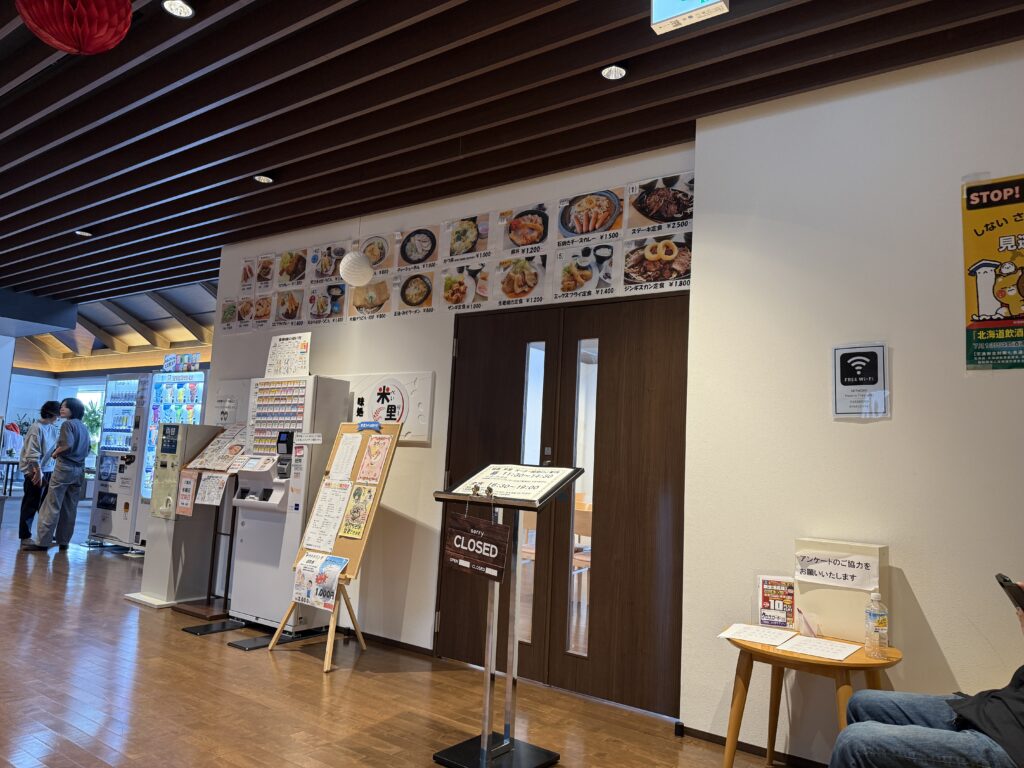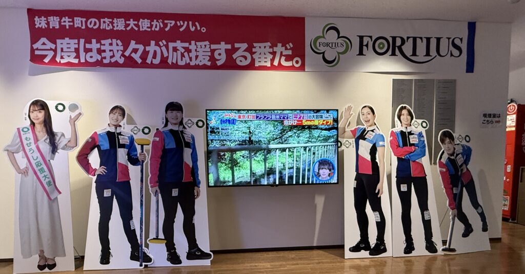 髪を乾かしてサッパリした後は、休憩所へ。 ここには妹背牛町の応援大使であるカーリングチーム「FORTIUS(フォルティウス)」の皆さんの大きなパネルが飾られていました。館内には「FREE Wi-Fi」が飛んでおり、ズラリと並んだガチャガチャコーナーや、きちんと仕切られた喫煙所も設けられています。 また、ラーメンからジンギスカン定食まで揃うお食事処「味処 米里(よねさと)」もありました。今回は旭川でお蕎麦を食べてから来ましたが、ここでサウナ飯(サ飯)をいただくのも良さそうですね。