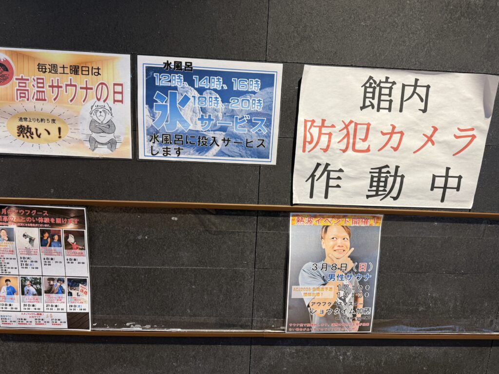 そして壁の貼り紙を見て驚いたのですが、なんと毎週土曜日は「高温サウナの日」で通常より約5度熱くなるとのこと。つまり、まさに私の大好きな93度設定になるわけですね!今回はタイミングが合いませんでしたが、アウフグースマスターによる熱波イベントも開催されているようです。次回はぜひ土曜日に合わせて来てみたいと思います。