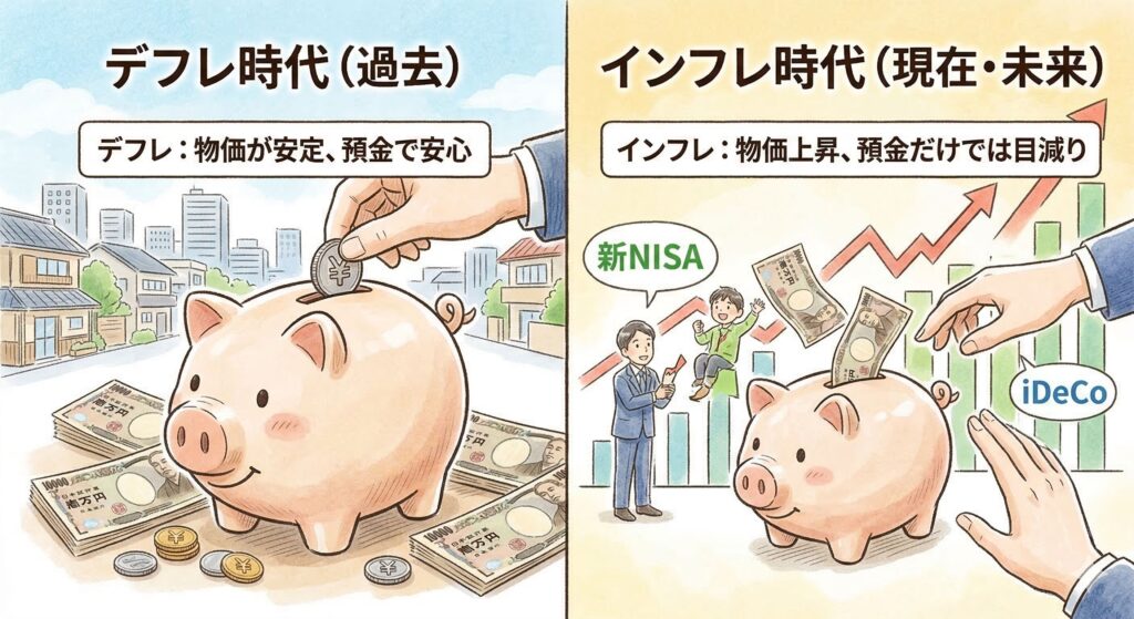 さらに、私たちが子供の頃や社会人になった頃から、日本はずっと「デフレ(物価が上がらない時代)」が続いてきました。そのため「お金は銀行に預けておけばとりあえず安心」というのが当たり前でした。