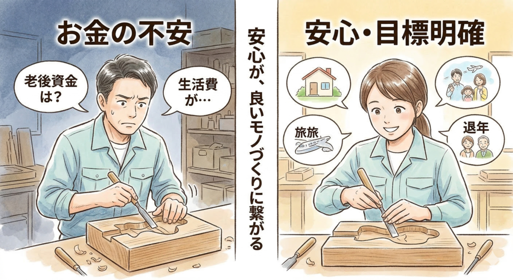 「老後資金は大丈夫かな…」といった漠然とした不安を解消し、正しい知識を身につけることで、「いつまでに、いくら必要か」がハッキリします。精神的なゆとりが生まれることで、日々の業務に対する集中力やモチベーションが高まり、結果として「より良いモノづくり」に繋がると信じています。