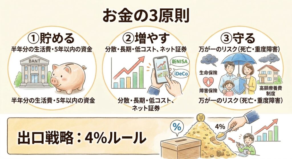 - ③ 守る: 不安だからと無駄な保険に入りすぎず、本当に必要な「万が一の大きなリスク」だけに絞る。